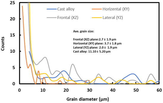 In addition to the texture evaluation, grain size distribution was also obtained from the EBSD investigation, as shown in Figure 6. From Figure 6, it was clear that the average grain size of L-PBF-processed alloy was about 1.4–1.7 μm, which was a couple of a magnitude larger than the cell size (Figure 4b’). In contrast, the grain size of the cast alloy was about 3.4 ± 0.2 µm.