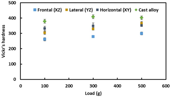The Vickers’s hardness of the materials was investigated under three different loads: namely, 100 g, 300 g and 500 g, and the evolution of hardness is shown in Figure 7. There is a slight increase in hardness with the increase in indentation loads, with similar trends for all the samples. This slight increase in hardness may be associated with local inhomogeneity under the indentation imprint. As can be seen from Figure 6, the hardness of cast alloy is somewhat higher (408 HV0.3) than that of the L-PBF-prepared samples (330–349 HV0.3), as reported in Table 1. In the literature, similar hardness values were reported for the as-built L-PBF Inconel 718 alloy, i.e., 296 HV [33]–320 HV [34]. The reported hardness of the cast alloy in the literature was 469 HV [33], higher than that found in the current investigation. Therefore, in general, the hardness of L-PBF-processed Inconel is lower than that of cast alloy. The origin of this lies in the microstructural evolution and the distribution of laves, carbide phases, and γ” precipitation, as reported by Zhou et al. [33]. As the presently investigated L-PBF Inconel 718 was not heat-treated/aged, the benefits of solution and precipitation hardening of this alloy were overwritten. Therefore, it is recommended that researchers to carry out appropriate heat treatment/aging of such alloys processed by L-PBF prior to service applications.