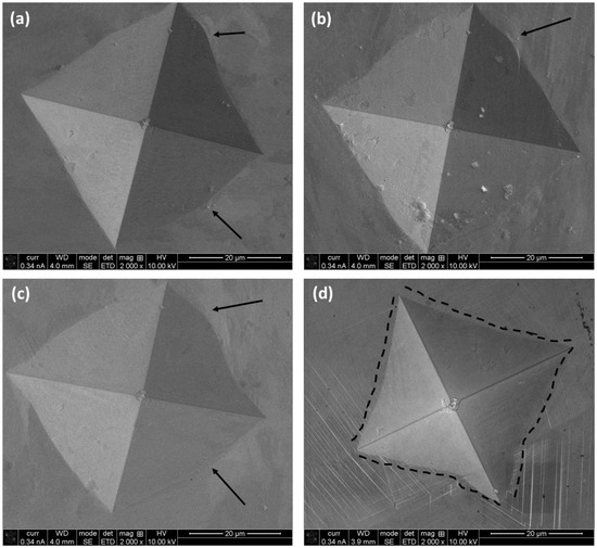 The SEM images of the residual imprints of hardness are shown in Figure 8. It is evident that there are no cracks along the corners of L-PBF-prepared samples (Figure 8a–c). However, pile-up does occur, as indicated by the arrows. The pile-up is generally associated with the ease of plastic flow of the materials [35]. In contrast, the cast alloy shows the shrinkage of the edges, which is similar to the one reported in the literature [36] and related to the high hardness of the material, i.e., higher resistance against the flow of the material. This was explored further by the nanoindentation, as reported in the next section.
