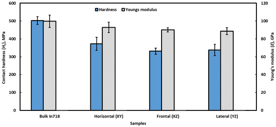 A number of mechanical properties of the investigated alloys, such as contact hardness (Hc) and Young’s modulus (E), were obtained by analyzing the unloading portion of the load–displacement curves [37], as shown in Figure 10 and also reported in Table 1. Both the hardness and Young’s modulus of the L-PBF-processed alloy are somewhat lower than those of cast alloy. Among different planes of the L-PBF-processed alloy, the horizontal plane exhibits a marginally higher properties than the frontal and lateral planes. This can be attributed to the microstructural evaluation of the L-PBF-processed alloy. In accordance with the microstructural arrangement, as reported in Section 3.1, during nanoindentation, melt-pool boundaries are parallel to the loading direction in the frontal and lateral planes. However, in the case of horizontal planes, such boundaries are perpendicular to the loading direction. Hence, there is a higher chance that the indentation resides in the melt-pool boundaries in the case of frontal and lateral planes and that it thus exhibits relatively lower mechanical properties. This in turn gives rise to anisotropy of mechanical properties of the alloy.