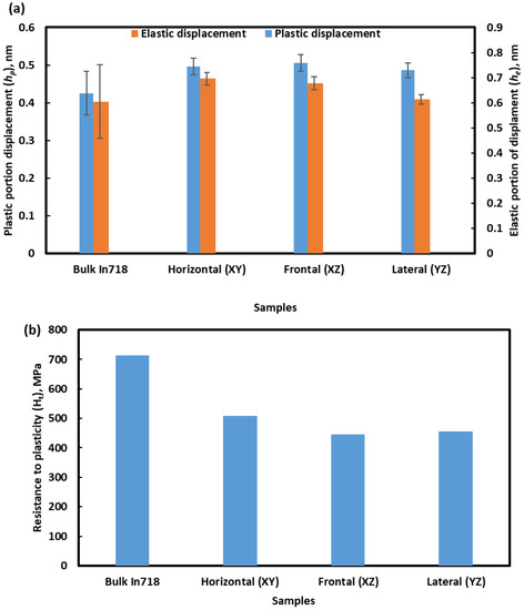 (a) Elastic (he) and plastic (hp) displacements and (b) resistance to plasticity (Ht) of presently investigated Inconel 718 alloys.