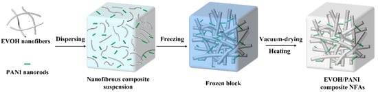 As illustrated in Figure 1, the fabrication process of EVOH/PANI composite NFAs included three main steps: the dispersion of EVOH nanofibers and PANI nanorods, freeze drying and heating. The EVOH nanofibers and PANI nanorods were first homogenized in a mixed solution to form uniform composite suspensions. The obtained suspensions were then frozen in a cryogenic refrigerator and dried into uncrosslinked EVOH/PANI composite NFAs with good formability. Finally, EVOH/PANI composite NFAs were generated by heat treatment. The sample names of composite NFAs and the corresponding addition amounts of EVOH and PANI are shown in Table 1.