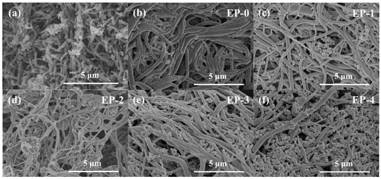 SEM images of PANI nanorods. (a) EVOH/PANI composite NFAs; (b–f) EP-0, EP-1, EP-2, EP-3 and EP-4.
