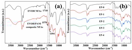 FTIR spectra: (a) EVOH NFAs and EVOH/PANI composite NFAs; (b) EVOH/PANI composite NFAs with various PANI nanorod contents.