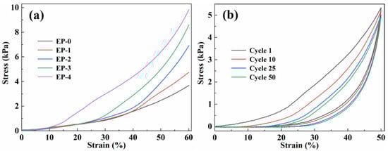 (a) Compressive stress–strain curves (ε = 60%) of EVOH/PANI composite NFAs with various PANI nanorod contents; (b) cyclic stress−strain curves of EP-1 with ε of 50%.