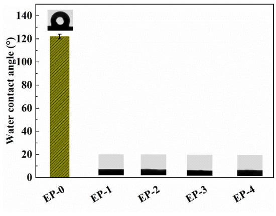 The adsorbents were designed for the removal of pollutants from water, so the surface wettability of composite NFAs is a crucial factor. The surface wettability of EVOH/PANI composite NFAs was characterized by the water contact angle. Generally, the water contact angle was <90°, indicating the hydrophilicity of the surface. In contrast, when the water contact angle was <90°, this represented the hydrophobicity of the surface. As shown in Figure 5, the water contact angle of pure EVOH NFAs is 122.0 ± 2.1°, showing good surface hydrophobicity. This is due to the micro- and nano-pore structure on the surface of aerogels that would reduce the water–solid contact area and because air was trapped under the water droplet [33]. After the addition of a small amount of PANI nanorods, the water contact angle decreased from 122.0 ± 2.1° to 0° immediately. With a continued increase in PANI contents, the water contact angle maintained 0° constantly. This is mainly because PANI nanorods can form hydrogen bonds with water and absorb the water droplets on the surface of aerogels [30]. Therefore, EVOH/PANI composite NFAs with good hydrophilicity can be used to absorb dyes and heavy metal ions in water.