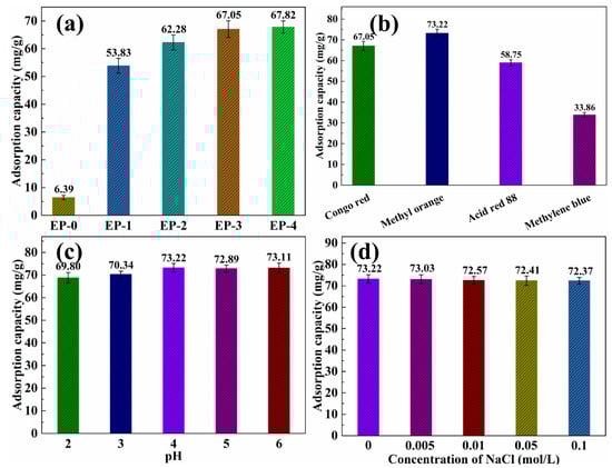 (a) Adsorption capacity of EVOH/PANI composite NFAs with various PANI nanorod contents for Congo red; (b) adsorption capacity of EP-3 for various dyes; (c) adsorption capacity of EP-3 for methyl orange under different pH values; (d) adsorption capacity of EP-3 for methyl orange under different ionic strengths.