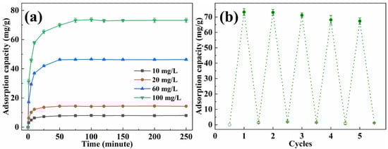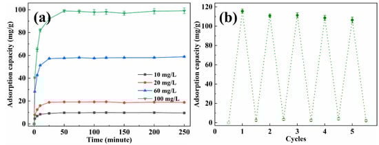 The adsorption capacity of EP-3 for Cr(VI) with various concentrations was also studied, and the results are shown in Figure 9a. As the concentration of the Cr(VI) solution increased, the equilibrium time also increased. The adsorption capacity increased quickly at first, and then the adsorption rate slowed down. The equilibrium adsorption capacity of Cr(VI) was 9.75 mg/g, 19.18 mg/g, 58.02 mg/g and 98.55 mg/g for 10, 20, 60 and 100 mg/L of the initial solution, respectively. Several adsorption–desorption cycles were performed to test the recyclability of EVOH/PANI composite NFAs. As shown in Figure 9b, after five cycles, the adsorption capacity decreased slightly, but it could keep over 92.1% of its initial adsorption capacity.