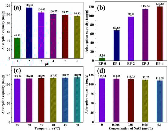 (a) Adsorption capacity of EP-3 for Cr(VI) under different pH values; (b) adsorption capacity of EVOH/PANI composite NFAs with various PANI nanorod contents for Cr(VI); (c) adsorption capacity of EP-3 for Cr(VI) under different temperatures; (d) adsorption capacity of EP-3 for Cr(VI) under different ionic strengths.
