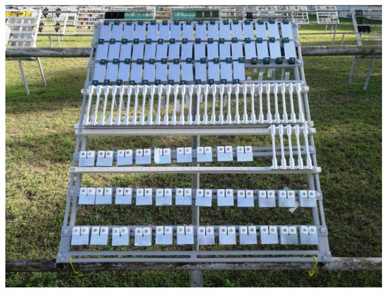 According to previous study [17], 7075-T73 (over-aged) alloy may possess a lower strength and better corrosion resistance compared with 7075-T6 (peak-aged) alloy. Thus, a 7075-type aluminum alloy rolled plate with a heat-treatment status of T73 was used as the object in this study. Its chemical composition was analyzed via inductively coupled plasma atomic emission spectrometric method (OES8000), and the results are listed in Table 1. The outdoor exposure test in the marine atmospheric environment was carried out in Wanning, Hainan Province, China. A previous study indicated that the average temperature, relative humidity, and Cl− deposition rate at Wanning were about 23.9 °C, 87.6%, and 14.5875 mg/(m2 d), respectively [18]. Two types of specimens were used: a plate with a size of 100 × 50 × 3 mm3 for observing the cross-section corrosion morphology and a dumbbell-shaped specimen with a test section diameter of 10 mm for testing the tensile properties, which were cut from rolled plate by wire-electrode cutting, and then they were polished to ensure the surfaces were smooth. All specimens were machined from the 7075 alloy rolled plate whose length was parallel to the extrusion direction. The specimens were placed in a rack that was fixed 45° to the south in an outdoor exposure field, as shown in Figure 1. The field was 350 m away from the ocean. After 1, 6, and 12 months of outdoor exposure, the specimens were used for observing the macroscopic morphology. After taking the photographs, the exposure test was continued. The total outdoor exposure time was 12 months. The sampling was performed every 6 months to observe the changes in weight loss, microstructure, and mechanical properties of the alloy. Three specimens were tested in each test, and their average value was shown in this study.