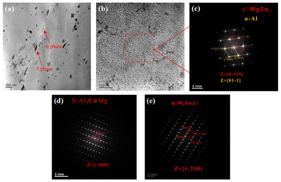 TEM images of the secondary phases of the 7075 alloy: (a) bright-field image of the grain boundary; (b) bright-field image of the grain interior; (c) diffraction spots of the secondary phase in the grain; (d) diffraction spots of S phase along the grain boundary; and (e) diffraction spots of η phase along the grain boundary.