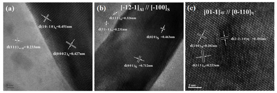 Figure 7 shows the high-resolution images of the secondary phases. As shown in Figure 7a, the lattice parameters of the η phase were a = b = 0.522 nm and c = 0.857 nm, showing an incoherent relationship with the Al matrix. The lattice parameters of the metastable phase and S phases were a = b = 0.505 nm, c = 1.402 nm and a = 0.4 nm, b = 0.925 nm, c = 715 nm, respectively, as shown in Figure 7b,c.