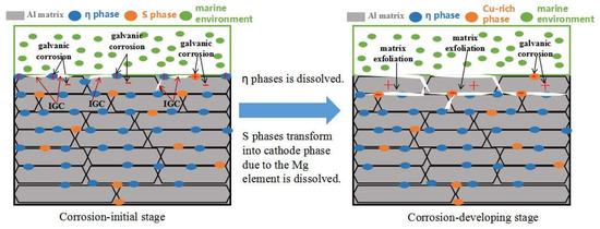 The potential of the η(MgZn2) phase in the 7XXX-type aluminum alloy was lower than that of the Al matrix, and the values were −0.86 V and −0.68 V, respectively [30]. Therefore, the η(MgZn2) phase was usually consumed as the anode phase. The S(Al2CuMg) phase was rich in Cu and Mg, and this phase was the anode phase relative to the Al matrix in the marine atmospheric environment. The Mg element was selectively dissolved. The Cu-rich residual phase remained and was transformed into a cathode phase relative to the Al matrix, accelerating the corrosion of the Al matrix. Therefore, the corrosion mechanism of 7075 alloy in a humid and hot marine atmospheric environment could be speculated as follows: The η(MgZn2) and S phases along the grain boundary were dissolved as the anodes in the initial stage of corrosion, resulting in IGC, and the η phase, which was continuously distributed along the grain boundary, favored the development of intergranular cracks. The S phase was gradually transformed from the anode to the cathode phase with the dissolution of the Mg element in the S phase. At this time, the Al matrix in the vicinity of the S phase along the grain boundary was corroded to generate an Al(OH)3 product, which led to an “embedding effect” along the grain boundary. Further, as corrosion proceeded, the IGC and “embedding effect” were gradually intensified, while the strip-shaped grain structure could not transfer the growing direction of intergranular cracks. The intergranular cracks were always extended along the long side of the grain. As a result, the matrix was exfoliated. The corrosion processes sketch of the 7075 alloy’s exposure to the marine atmospheric environment is shown in Figure 8.