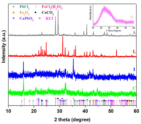 X-ray patterns of the broken glasses (G) and prepared composite materials (C—mixture of glasses and cash iron, I—mixture of glasses and iron powder, L—mixtureof glasses and lead powder, A—mixture of glasses and ash).