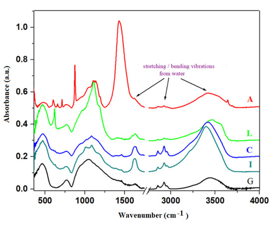The prominent IR band centered at about ~3435 cm−1 is assigned to the H-O stretching vibrations from adsorbed water molecules on the surface of the sample and the presence of stretching vibrations of the Si-OH bonds. The IR band centered at about 1600 and 2900 cm−1 is assigned to the H-O-H bending vibrations and hydroxyl units [23]. For cast-iron (C) and iron (I) composite materials, these IR bands were gradually enhanced due to the presence of a higher number of Si-OH units.