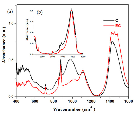 FTIR spectra of the validated and expired cement (EC) materials are plotted in Figure 3. The inspection of the IR bands located between 800 and 1100 cm−1 indicates the formation of C-S-H in the validated cement material due to the increase in the intensity of these bands.