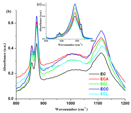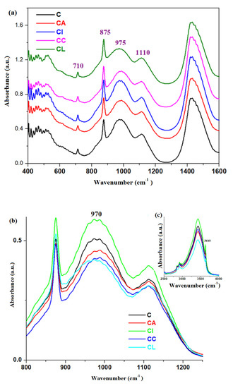 FTIR spectra of cement and composite-cement materials performed at 28 days after their preparation in the region between (a) 400 and 1600 cm−1, (b) 800 and 1250 cm−1,and (c) 2500 and 4000 cm−1.