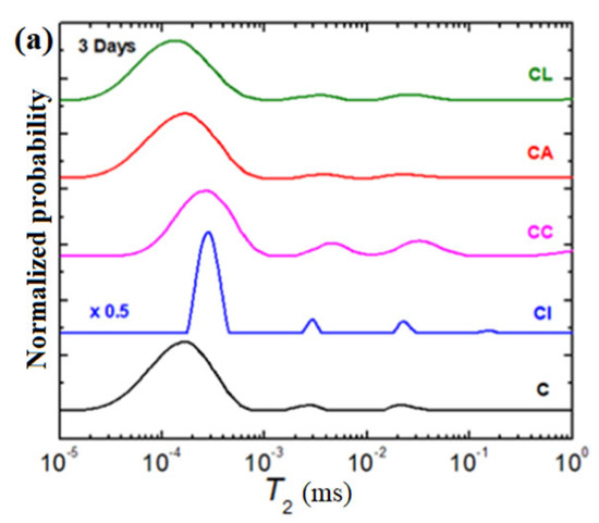 After 28 days, the CI, CA, and CC composite-cement materials are not evidenced in water reservoirs of large pores. This evolution suggests that the water is consumed preferentially from the large pores during the hydration of the cement mixture. The position of the maximum of the main peak shifts to shorter T2 relaxation times for the CI and CA samples and moves to longer T2 relaxation times for the CC paste. The differences in the position of the water bounded in the cement materials can be attributed to the mobility (dynamics) of the material components [19]. The CL sample has less dynamic behavior.