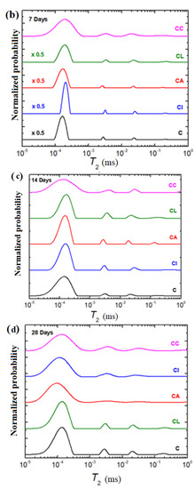 The possibility ofthe characterizationof water reservoirs and the evolution of pores inside the samples can be better identified using a numerical Laplace inversion for CPMG relaxation curves. The relaxation time distributions (T2) obtained by the inverse Laplace algorithm of the simple cement and composite-cement materials performed at 3, 7, 14, and 28 days after their preparation are presented in Figure 7.
