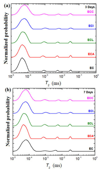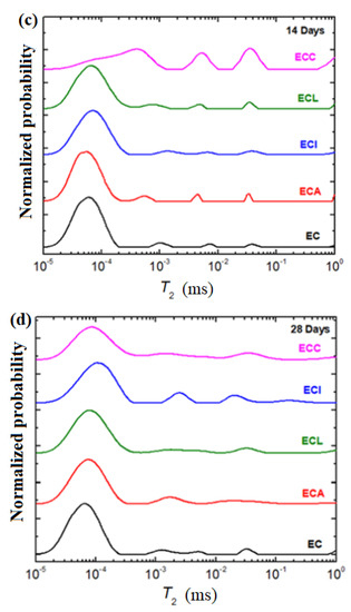 In conclusion, the water reservoirs inside the composite-cement materials are mainly due to the consumption from large pores in the first stage. The process can be interpreted as the migration of water from large to small pores. Thereafter, with the acceleration of the hydration process, the water in medium and small pores can be quickly used for the hydration reaction. For the expired cement material, the water in large pores was evidenced in all samples up to 14 days. For the ECC and ECL samples at 28 days, the water was redistributed in the signal with a shorter relaxation time corresponding to the small and medium pores.