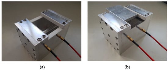 To achieve a surface current whose direction is parallel to the carbon fibers, a resonator based on a transverse magnetic (TM) or transverse electromagnetic (TEM) waveguide can be used. For a straight waveguide with constant cross section this results in parallel surface currents that are in line with the propagation direction of the modes. To avoid issues with unknown contact resistances between the cavity and the sample, the border of the wall section that is replaced by the sample should coincide with points where the surface currents vanish. For a straight cavity, lines with zero surface currents transverse to the propagation direction of the modes exist due to the equality of forward and backward propagating modes in the cavity. Here, a straight waveguide with rectangular cross section is used. Assuming the Equation (9) leads to . In addition, the normal magnetic field is zero.
