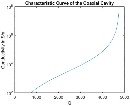 The first step in generating the characteristic curve is to measure the unperturbed cavity covered only by the aluminum lid as a reference. The measurement of the quality factor for the aluminum lid gave mean values between 4855 and 4856 for repeated measurements with varying lid orientations. The highest standard deviation over one measurement interval was 3.9. The accuracy of the reference measurements using the aluminum lid is therefore limited by the accuracy of the quality factor measurement achieved with the network analyzer. When measuring over a prolonged period of time, a slight drift can be observed in the value of the quality factor. It is therefore advisable to measure the reference before and after measurements of the samples under test. While the repeatability of the reference measurement is excellent, the absolute value of the quality factor is significantly lower than in the simulation. This is thought to result from imperfect contact between the center conductor and side walls with the endplates as well as from imperfections in the surface quality of the cavity walls. As the contributions of these additional loss mechanisms on the quality factor cannot be separated, they are combined into a single additional loss term and added to the simulation. In this case, a surface roughness was introduced and adjusted to match the results of the measurement in the CST simulation. When the simulation and the measurement of the reference are in agreement the characteristic curve of the cavity can be acquired by sweeping the sample conductivity in the CST model. The resulting curve shown in Figure 3 can then be used to relate the Q values, measured with a sample on the cavity, to the samples’ conductivity. In the range from S/m to S/m, which is the typical conductivity range for carbon fiber composites, the characteristic curve has a shallow slope, allowing very accurate measurements in this range. At high conductivities, the slope increases significantly, making the measurement setup impractical for the measurement of samples with conductivities above S/m.