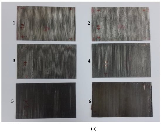 Pictures of samples are shown in Figure 4. For the prepreg samples in Figure 4b, only one of the samples is depicted as there is no visible difference between the individual samples.