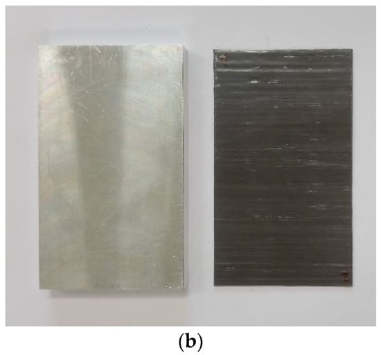 Pictures of samples under test: (a) CFRTP samples with different fiber volume contents. (b) Aluminum reference (left) and prepreg sample (right).