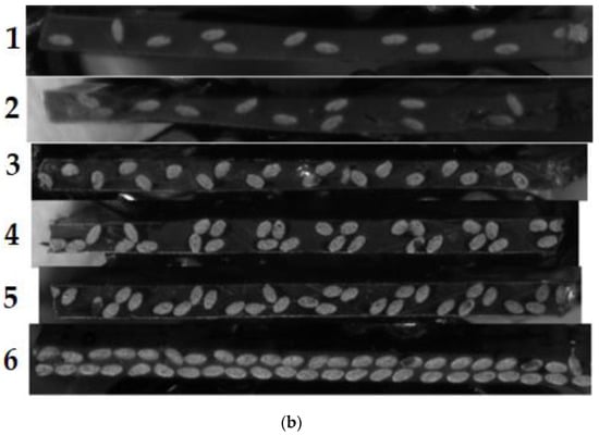 As is evident from Figure 4a, the distribution of carbon fibers in the CFRTP samples is not homogeneous. This is due to the manufacturing process, as the fiber bundles within the reinforced 3D printing filaments do not spread out during the fusing of the filaments. Within the reinforced filaments, the fibers are also not evenly distributed. Instead, they accumulate in the center as a compact bundle covered by a layer of pure thermoplastic. To obtain a better understanding of the sample structure, microscope images were made from segments of all six samples. For Sample 1, images were made covering the whole length of the sample to get an estimate for the variation of the fiber distribution across the sample. For the remaining samples, images were only made for a small section of each sample. The microscope images are presented in Figure 5.