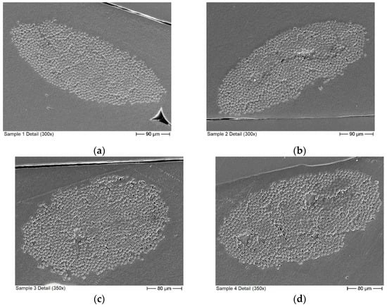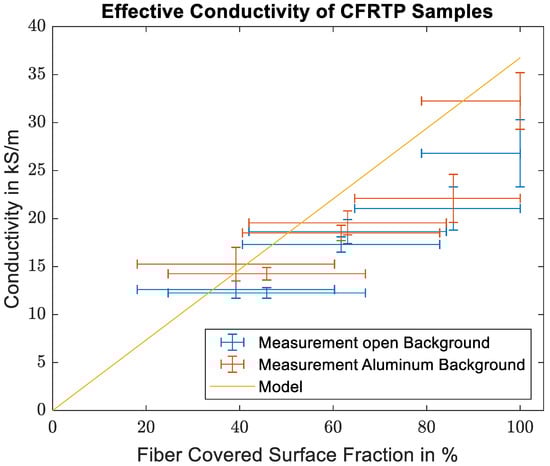 As mentioned above, while the conductivities from the CFRTP measurements show the linear trend between the number of conducting filaments and the measured conductivity as expected, the exact values show a distinct offset to the mixing rule. This difference is caused by the imperfect distribution of the fibers in the sample compared to the homogeneous distribution assumed in the mixing rule. From the fiber conductivity given in the datasheet, the skin depth within the carbon fibers is 42 µm. While this is larger than the single fiber diameter of 7 µm, it is still much smaller than the diameters of the fiber bundles. Therefore, mainly the first few layers of fiber in each bundle contribute to the measured surface impedance. Bundles in the second row or unreinforced plastic in front or between the bundles do not significantly influence the surface impedance. A more accurate way of describing the sample should therefore take into account the sample surface covered by the fiber bundles. Judging from the detail picture in Figure 6, the fiber distribution within the bundle can be considered homogeneous. Therefore, the classical mixing rule can be used to calculate the effective conductivity of the fiber bundle. The fiber volume content within the bundle was determined from the SEM images to be between 60% and 65%. The effective conductivity of the sample is then estimated from the product of the effective conductivity of the bundle and the bundle covered sample surface. The covered surface was estimated from the microscope images in Figure 5b, and an estimate for the error was made from the variations in the individual segments from the detailed images of Sample 1 shown in Figure 5a. The maximum deviation of the segments to the total covered area fraction is 21.1%.