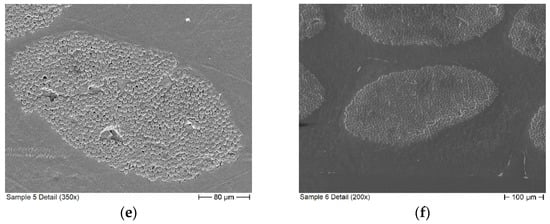 For the measurements of the CFRTP samples, the measured Q of the aluminum reference varies between 4849 and 4861. The results for the CFRTP samples are presented in Table 2. Like the prepreg samples, the CFRTP samples show a clear influence on sample placement. However, in contrast to the prepreg samples, the influence of the sample surface is much higher compared to other repositioning influences. This is especially apparent for Sample 6, for which one side has a significant amount of surface defects which are visible with the naked eye. One of these defects can be seen in Figure 6f in the bottom right corner. An optical profilometry measurement of Sample 6 provided a root mean square surface roughness of 24 µm for the surface with defects and 2.5 µm for the smooth surface on the opposite side. For the other samples, there is no apparent quality difference between the surfaces. This fits the measurement results in Table 2, as Sample 6 has a significantly larger range between the minimum and maximum of the measured Q than other samples.