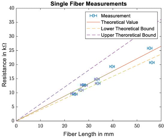 Figure 7 shows the comparison of the measured resistivities for the single carbon fibers and the theoretical values based on the manufacturer’s information. As the measured resistances are in the kΩ range, the contact resistances between the carbon fibers and the copper electrodes as well as between the copper electrodes and the multimeter electrodes are neglected. While the data sheet for the T300 carbon fibers specifies a fiber diameter of 7 µm, measurements of fiber diameters presented in [10] show that the actual diameter varies between 6 µm and 7.4 µm. The solid line denotes theoretical resistance based on the fiber diameter given in the data sheet, while the dashed lines denote the boundaries of the theoretical resistance based on the measured fiber diameters in [10]. As the fibers are not always placed perfectly straight, an error of up to 1 mm is assumed for the fiber length measurement. As can be seen, the theoretic and measured values coincide quite well. Going forward, the fiber conductivity of specified by the manufacturer is used.