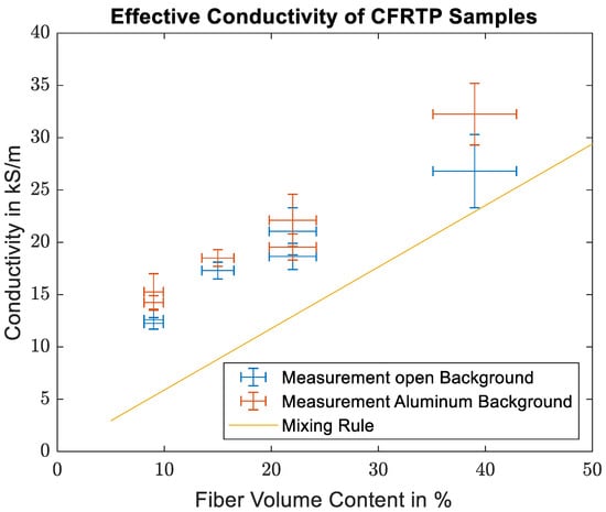 Comparison of the calculated effective conductivities of the CFRTP samples with the theoretical values found using the mixing rule.