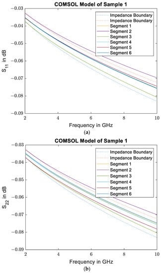 To obtain an understanding of the local variation of the effective conductivity due to the irregular placement of the fiber bundles, a planar 2D COMSOL model is set up from the detailed images of sample 1. Each of the sample segments is simulated individually. The fiber bundles are modeled using solid ellipses with the effective conductivity calculated from the Maxwell–Garnett rule. The upper and lower boundaries are set to be perfect magnetic conductors, which results in a plane wave that is incident on the sample with the electric field and induced currents oriented alongside the fibers in the out-of-plane direction. The S-parameters resulting from the simulation are depicted in Figure 10, and the validity of the very small S11 values was checked using a mesh refinement study. From looking at the reflection of the wave at both sample surfaces, it is obvious that there is some variation between the different segments. In addition to the shift in the curves, there is also some variation in the frequency dependence of the individual segments. This implies a frequency-dependent influence of the exact geometries on the material’s effective conductivity. A mixing rule can therefore only provide a rough estimate of the effective conductivity of such an irregular sample. Further examination of the reflection shows a significantly higher phase shift than expected for an impedance boundary with comparable conductivity. The effective conductivity of the sample segments can therefore not be calculated from the simulated reflection coefficient. The absolute value of the simulated reflection coefficient can, however, be compared to the reflection coefficient of an ideal impedance boundary. The reflection of the impedance boundaries is also included in Figure 10. Due to the variance in frequency dependence the impedance boundaries can only be matched at a single frequency. In this case, the boundary was matched at 2.45 GHz, as it corresponds to the operating frequency of the measurement system. The conductivities found for the impedance boundaries were 12.2 kS/m and 16.1 kS/m, which coincides well with the measured bounds for Sample 1, which are 11.7 kS/m and 14.9 kS/m.
