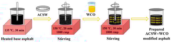According to the results of previous studies conducted in our laboratory on the physical and rheological behavior of ACSW and WCO compound-modified asphalt, we determined that 6%ACSW and 1%WCO, 6%ACSW and 2%WCO, 8%ACSW and 2%WCO compound-modified asphalts have the most desirable performance. Thus, the above ratios of ACSW and WCO compound-modified asphalt binders were produced, and ASCW single-modified asphalt was also produced as a control group. The preparation method for ACSW and WCO compound-modified asphalt was presented in Figure 1. First, the base asphalt binder was melted in an oven at about 135 °C, and then ACSW (based on the mass ratio of the base asphalt) were mixed with base asphalt and blended by a high-speed shear mixer, stirring at 1000 rpm for 20 min at 150 °C. Subsequently, a predetermined mass of WCO (based on the mass ratio of the base asphalt) was added and mixed for 30 min to guarantee uniform modifier distribution in the asphalt. Finally, using a thermostat, the mixed compound-modified asphalt binders were maintained at 150 °C for 30 min. To maintain the homogeneity of the test conditions, the base asphalt was processed in the same way. A total of 5 types of asphalt binders were designed to investigate asphalt mixture performance, and their abbreviations and physical properties are listed in Table 5.