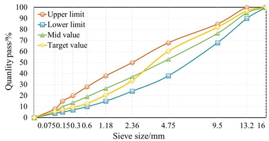 The coarse aggregate, fine aggregate, and mineral filler employed in the test were limestone, and their physical parameters were assessed following JTG E42-2005 specifications [40]. The test results and requirements (JTG F40-2004 [39]) are exhibited in Table 4.