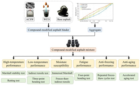 In the investigation, the ACSW and WCO compound-modified asphalt mixture was assessed considering high-temperature, low-temperature, moisture susceptibility, fatigue, anti-freezing, and anti-aging performance. Three parallel tests were performed for each experimental test to reduce random errors and improve the accuracy of the experimental results. Figure 3 illustrates the testing materials and experimental processes.