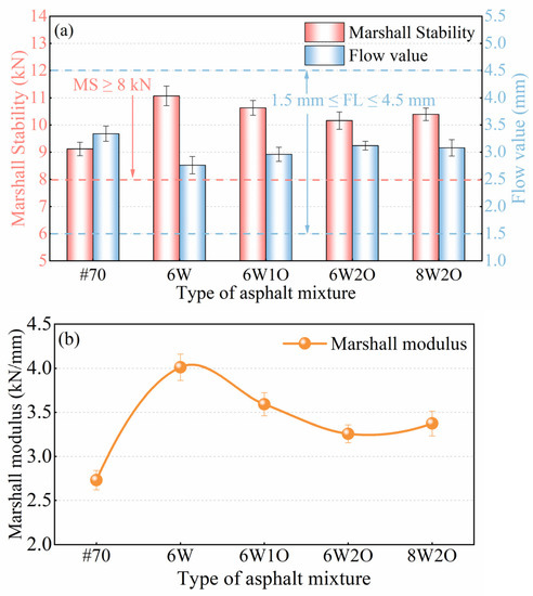 FL refers to the equivalent amount of deformation when the specimen’s Marshall stability achieves its highest value. The FL results of the asphalt mixtures are presented in Figure 4a. All values satisfied the demands of the technical standards for heavy traffic in long hot summer areas (i.e., an FL no less than 1.5 mm and no greater than 4 mm [39]). The FL of different types of modified asphalt mixtures were all increased. The change of the FL of the 6%ACSW modified mixture was the most significant, it decreased by 17.4% from 3.34 to 2.76 mm, indicating that adding ACSW can minimize the deformation of asphalt mixtures under loading. After adding WCO, the FL of the ACSW and WCO compound-modified asphalt mixture showed a gradual increase with an increase of WCO. However, the FL of the compound-modified asphalt mixtures was notably less than that of the base asphalt mixture.