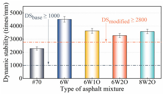 The DS is used here to indicate the asphalt mixture’s deformation resistance at high temperatures, as depicted in Figure 5. According to the specifications [39], the DS of the base asphalt mixture was 2287 times/mm, satisfying the limit of more than 1000 times/mm in hot summer regions, and the DS of all modified asphalt mixtures was more than 2800 times/mm, which also satisfied the corresponding requirement. In contrast to the base asphalt mixture, after the single addition of 6%ACSW, the DS of the modified asphalt mixture increased by 97.3% from 2287 to 4512 times/mm. This finding is consistent with the results obtained in an earlier investigation reported by Fan et al. [43] that the ACSW provide strength and stiffness to asphalt mixture, resulting in better-resisting deformation under high-temperature conditions. In contrast to the ACSW-modified asphalt mixture, there was a minor decrease in DS with an increase in the WCO level. However, in comparison to the base asphalt mixture, the DS of 6%ACSW and 1%WCO, 6%ACSW and 2%WCO, 8%ACSW and 2%WCO showed a significant increase of 58.9%, 43.4%, and 56.8%, respectively. Combining the findings of the Marshall and rutting tests, the ACSW and WCO compound modification showed an obvious enhancement in the asphalt mixture’s permanent deformation resistance under a high-temperature environment.