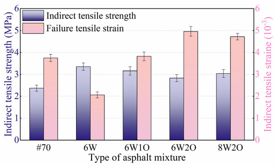 Higher ITS and higher failure tensile strain indicate greater low-temperature crack resistance in an asphalt mixture [36]. The low-temperature ITS test results are illustrated in Figure 6. The ITS of the modified asphalt mixtures were found to be larger than those of the base asphalt mixture. The asphalt mixture ITS increased from 2.37 to.3.35 MPa after the addition of 6%ACSW. This result shows that introducing ACSW obviously enhanced the low-temperature ITS. The ITS of the ACSW single-modified asphalt mixture was slightly reduced after the introduction of WCO. Notably, the ITS of the 6%ACSW and 1%WCO, 6%ACSW and 2%WCO, and 8%ACSW and 2%WCO compound-modified asphalt mixtures were still 33.3%, 19.4%, and 28.3% greater than that of the #70 asphalt mixture.