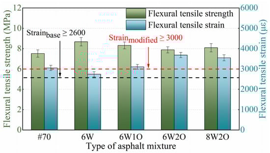 Flexural tensile strength and maximum flexural tensile strain are indicators used to evaluate the low-temperature tensile properties of asphalt mixtures [44]. Greater flexural tensile strength and greater maximum flexural tensile strain indicate that the asphalt mixture has a more desirable low-temperature tensile performance [45]. The three-point bending test results are presented in Figure 7. The low-temperature maximum flexural tensile strain of the base asphalt mixture was 3052 με, which meets the requirement of greater than 2600 με in cold regions with severe winters [39]. In addition, except for the ACSW single-modified asphalt mixture, the maximum flexural tensile strain of the other compound-modified asphalt mixtures met the standards of the modified asphalt mixture no less than 3000 με [39]. The maximum flexural tensile strain of the 6%ACSW modified asphalt mixture decreased, indicating that the single modification of ACSW is detrimental to low-temperature properties. After adding WCO, the flexural tensile strain of the modified asphalt mixture slightly increased. When the WCO content continued to increase to 2%, the flexural tensile strain was enhanced by 34.2% and 20.7%, respectively, compared to the ACSW single-modified and base asphalt mixtures. On this basis, when the ACSW modifier was increased to 8%, the flexural tensile strain of the 8%ACSW and 2%WCO compound-modified asphalt mixture was slightly reduced but still obviously greater than that of the ACSW single-modified and base asphalt mixtures. It shows that the WCO offered an outstanding contribution to improving the asphalt mixture’s low-temperature tensile performance. This phenomenon could be that adding WCO improves the flexibility of the asphalt mixture by reference to the paper by Niu et al. [35], thus enhancing the resistance to cracking to a certain degree at low temperatures. Based on a comprehensive comparison of four different ratios of modified asphalt mixtures, the 6%ACSW and 2%WCO compound-modified asphalt mixture had greater flexural tensile strength, as well as a more desirable maximum flexural tensile strain at low temperatures.