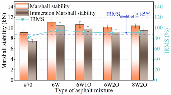 An immersion Marshall stability test was performed to assess the moisture susceptibility of the compound-modified asphalt mixtures that were subjected to water erosion at high temperatures. According to the test method of T 0709, JTG E20-2011 [41], one set of Marshall samples was held for 35 min in a 60 °C water bath, and the other set of Marshall samples was maintained for 48 h. Then, the test was performed separately under different conditions to calculate the immersion residual Marshall stability (IRMS), as shown in Equation (8):