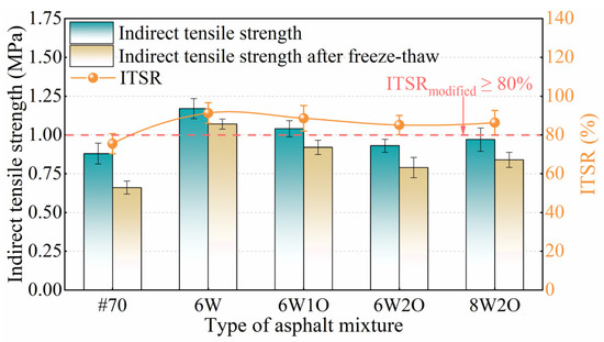 The low-temperature moisture susceptibility results are presented in Figure 9. According to the requirements of the technical specifications [39], the ITSR of the base asphalt mixture and modified asphalt mixture ought to be more than 75% and 80%, respectively, in areas where the average rainfall exceeds 500 mm. Notably, all types of asphalt mixtures fulfill the relevant standards. In addition, the higher the ITSR of the modified asphalt mixture is, the better the mixture’s resistance to water damage. The ITSR and IRMS of the asphalt mixtures showed similar trends. The ITSR of the 6%ACSW modified asphalt mixture was maximum with 91.3%, which was 15.8% greater than that of the base asphalt mixture, again proving that ACSW can improve moisture susceptibility. The ITSR of the ACSW and WCO compound-modified asphalt mixtures were slightly lower than those of the single-modified asphalt mixture. The ITSR of the 6%ACSW and 1%WCO, 6%ACSW and 2%WCO, and 8%ACSW and 2%WCO compound-modified asphalt mixtures increased by 13.1%, 9.6%, and 10.8%, respectively, compared to the base asphalt mixture. This result indicates that adding the appropriate proportions of ACSW and WCO to the base asphalt guarantee desirable moisture sensitivity of the asphalt mixture.