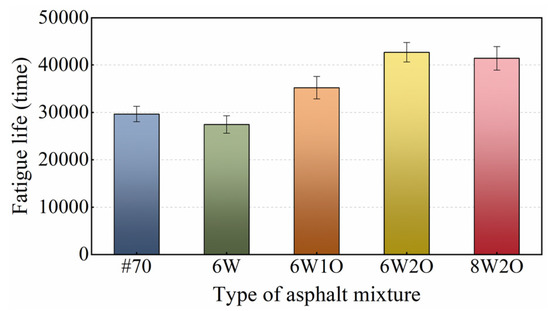 The four-point bending test results are presented in Figure 10. Compared to the base asphalt mixture, the fatigue life of the ACSW modified asphalt mixture was slightly enhanced, while the fatigue life of the compound-modified asphalt mixtures increased obviously. Among them, the 6%ACSW and 2%WCO compound-modified asphalt mixture offered the best fatigue life, followed by that of the 8%ACSW and 2%WCO, 6%ACSW and 1%WCO compound-modified asphalt mixtures. Compared with the base asphalt mixture, the fatigue life of the 6%ACSW and 2%WCO compound-modified asphalt mixture increased by 44%, and the fatigue performance was enhanced notably. The fatigue life of the asphalt mixture was enhanced with an increase in WCO content or a decrease in ACSW content, indicating that WCO had a positive impact on fatigue life, while ACSW had a negative influence. However, the fatigue lives of the above compound-modified asphalt mixtures were still superior to those of the base asphalt mixture, demonstrating that WCO was able to compensate for the fatigue life loss caused by ACSW. After ACSW and WCO compound modification, the asphalt mixture achieved a higher fatigue life, improving the life span of the asphalt pavement.