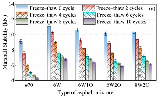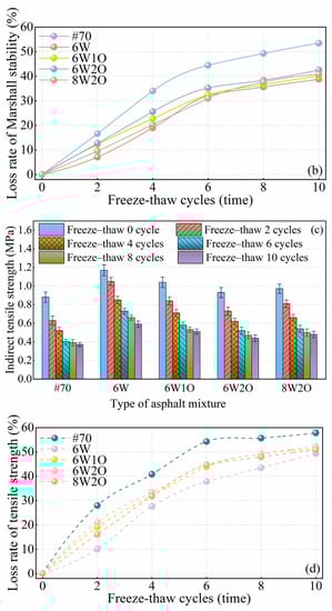 The repeated freeze–thaw cycle test, compared to the moisture susceptibility test, can better reflect the degree of damage of asphalt mixtures in cold and frozen regions. This is because, in the freezing stage, the pore water of the asphalt mixture freezes, and freezing swelling occurs, while in the thawing stage, water flows into the new cracks produced by freezing and swelling. Thus, the repeated freezing and thawing effect will cause high- and low-temperature properties damage to the asphalt mixture. Referring to the moisture susceptibility test method, the repeated freeze–thaw cycle test process first involved vacuum-filling the chamber with water, followed by freezing at −18 °C for 16 h and then placing the mixture in 60 °C water for 8 h. The high-temperature Marshall stability and low-temperature indirect tensile strength were tested following 2, 4, 6, 8, and 10 repeated freeze–thaw cycles, and the loss rates (Equations (13) and (14)) were calculated to evaluate the anti-freezing performance:
