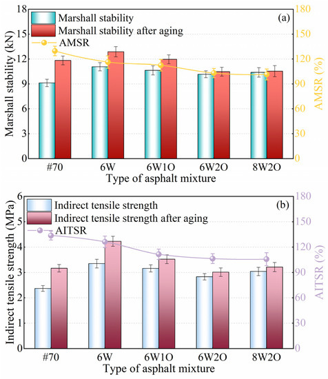 Test results of anti-aging performance. (a) Test results of Marshall stability and AMSR after aging. (b) Test results of indirect tensile strength and AITSR after aging.