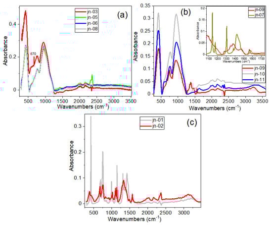 Comparison of FTIR spectra in powder form for samples (a) jn-01 and jn-07 and (b) for samples jn-07 and jn-04.