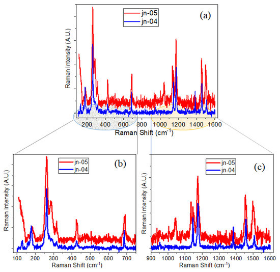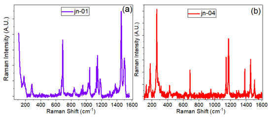 The Raman spectra of powder samples jn-01 and jn-04 are presented in Figure 4a,b. In the Raman spectra, peaks are seen that match up with the peaks of the corresponding ZIFs, which is in good agreement with data from the literature [52,53,54,55,56,57,58]. As seen in Figure 4a, sample jn-01 shows the vibrational band characteristics of ZIF-8 (ZIF-L) that have been previously published in various papers [52,56]. In particular, the most intense bands are observed at 686, 1146, and 1458 cm−1 in the range of 500–3200 cm−1, which correspond to the out-of-plane bending vibration of the imidazole ring, C5–N stretching vibration, and methyl bending vibration, respectively [52,56]. In addition, the antisymmetric C-H stretching vibration in the methyl group is about 2930 cm−1, and the C-H stretching vibration of the imidazole ring appeared at 3131 cm−1.