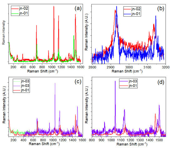 Comparison of Raman spectra of pure ZIF-L/-8 (jn-01) powder sample and ZIF-8 impregnated into (a,b) unetched (jn-02) and (c,d) etched (jn-03) pores of MCG plates shown in different regions. More detailed spectral presentation can be seen in Figure S6.