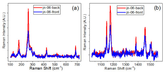Raman spectra measured in different regions, (a) 100–750 cm−1 and (b) 1000–1600 cm−1, for ZIF-67-1 infiltrated into etched MCG channels, sample jn06, from the front (blue line) and from the back (red line) sides of the MCG plate.